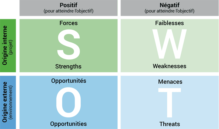 - Menaces : Les risques extérieurs qui pourraient freiner votre progression : concurrence féroce, évolution défavorable de la demande, pression réglementaire…